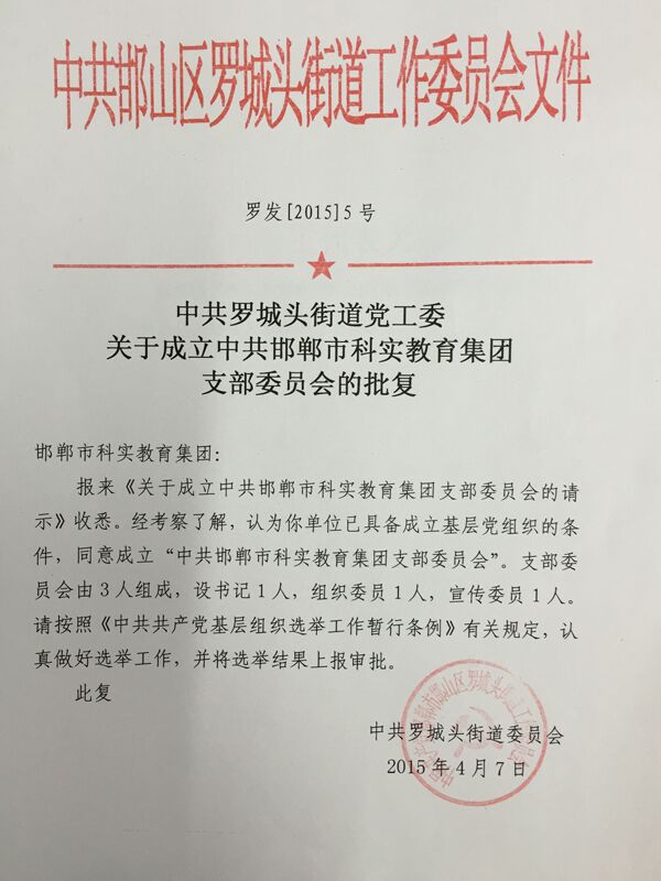 2015年6月9日,經(jīng)中共羅城頭街道黨工委批準(zhǔn)成立邯鄲市科實教育集團(tuán)支部委員會,韓捷擔(dān)任支部書記。