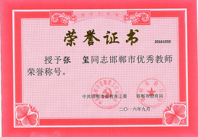 在市委、市政府和省教育廳的正確領(lǐng)導下,在市人大、市政協(xié)的監(jiān)督下,一年來,張校長領(lǐng)導全體教職員工緊緊圍繞“提高教育教學質(zhì)量、辦好人民滿意教育”這一核心目標,艱苦奮斗,改革創(chuàng)新,無私奉獻,使教育工作取得顯著成績。2016年9月,張校長榮獲“邯鄲市優(yōu)秀教師”榮譽稱號。