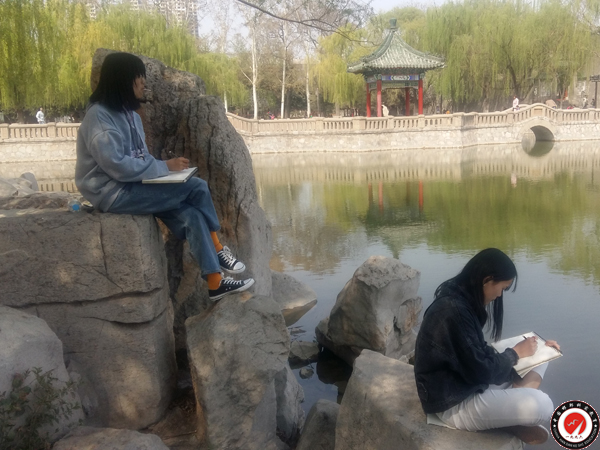 下午,我們到叢臺公園進(jìn)行實(shí)地寫生,沿河而坐,眼中的風(fēng)景躍然紙上。你在橋上看風(fēng)景,看風(fēng)景的人在場外看你,春景裝飾了你的畫卷,你裝飾了我的夢!