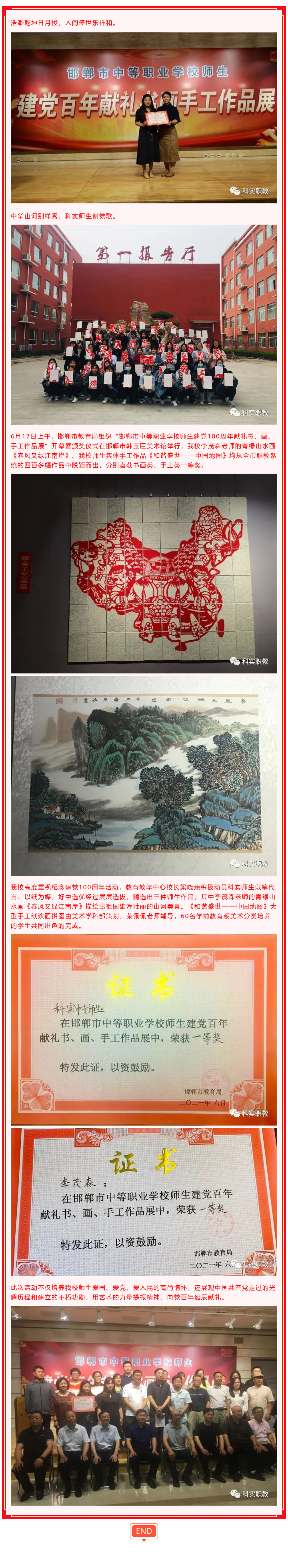 祝賀我校美術(shù)作品榮獲“邯鄲市中等職業(yè)學(xué)校師生建黨100周年獻(xiàn)禮書、畫、手工作品展”一等獎(jiǎng)