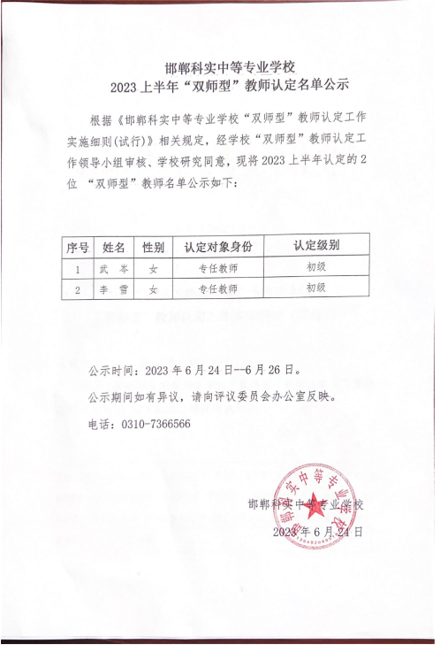 邯鄲科實(shí)中等專業(yè)學(xué)校2023年上半年“雙師型”教師認(rèn)定名單公示